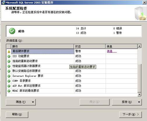 3. 點擊下一步,系統(tǒng)開始對系統(tǒng)配置進行檢測,(正常情況有1個警告或者沒有警告,根據(jù)電腦配置而定,這個不影響)。