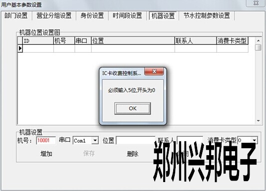 在軟件上添加水控機,售飯機相應的機器號:打開軟件,系統(tǒng)管理---用戶參數(shù)設(shè)置---用戶基本參數(shù)設(shè)置---機器設(shè)置,在機號那添加相應的機器號,例如10001就是1號機,串口選擇電腦所用的通訊串口。如下圖所示,圖中所用的通訊串口為COM1。但在極其特殊的情況下,會出現(xiàn)錯誤提示,機器號開頭為0。如圖所示。
