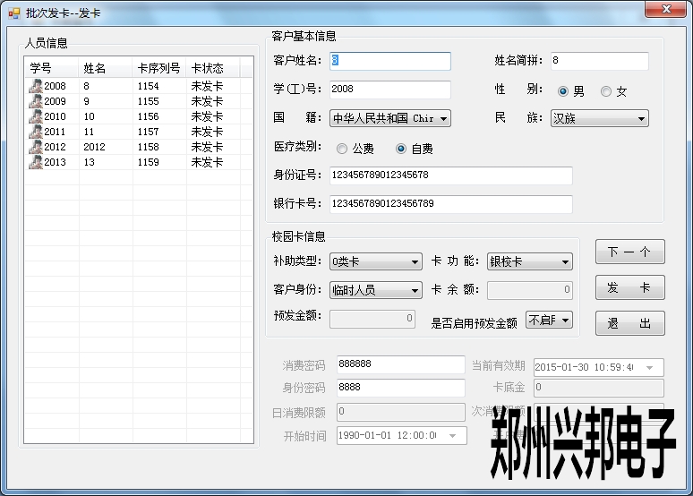 信息發(fā)卡需要在信息設(shè)置中將基本信息錄入,可以連續(xù)錄入多條信息。然后在空白處右鍵點(diǎn)擊信息發(fā)卡,按學(xué)號(hào)或者姓名查詢未發(fā)卡的信息直接雙擊,選擇輸入預(yù)發(fā)金額將卡片放于讀卡器上直接點(diǎn)擊發(fā)卡即可;也可以直接選擇未發(fā)卡的信息右鍵選擇信息發(fā)卡進(jìn)行發(fā)卡。