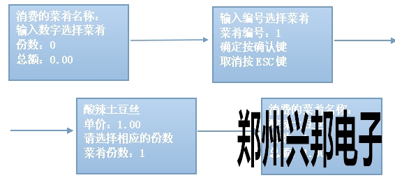 IC卡中文液晶消費(fèi)機(jī)菜肴消費(fèi)模式的設(shè)置和使用,菜肴消費(fèi)模式:包含計(jì)算和自動(dòng)模式自動(dòng)模式:輸入菜肴編號(hào),點(diǎn)擊確認(rèn)后選擇份數(shù),點(diǎn)擊確任后出現(xiàn)消費(fèi)的菜肴名稱、份數(shù)、總額,將卡片放于刷卡區(qū),即可進(jìn)行扣費(fèi),扣費(fèi)后顯示扣費(fèi)金額、手續(xù)費(fèi)用、卡上余額、卡號(hào),操作流程如下圖所示: