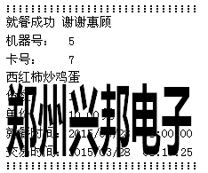 計(jì)算模式下按‘+’號(hào)鍵可進(jìn)行取餐,取餐時(shí)將需要取餐的卡放到刷卡區(qū),消費(fèi)機(jī)可自動(dòng)讀取卡片上的訂餐信息,并將其顯示出來(lái),按‘+’號(hào)鍵可翻頁(yè)查看訂餐信息,按‘確認(rèn)’可進(jìn)行取餐,取餐成功后會(huì)顯示就餐成功、菜肴名稱、份數(shù)、扣費(fèi)金額,若連接的有打印機(jī),可打印取餐信息,打印的格式如下圖所示: