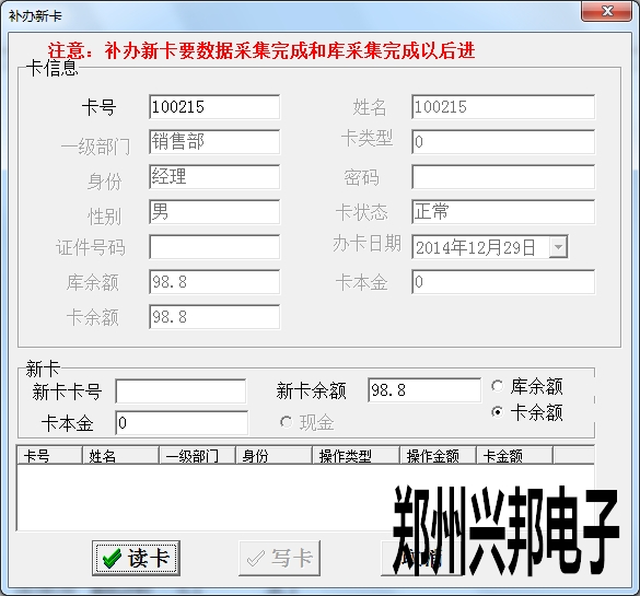 注: 收繳舊卡是卡片不再使用將卡片收回的操作,進行讀卡,卡庫一致的情況下就可進行寫卡,退還卡余額完成操作。收繳回來的卡可以重新發(fā)行。